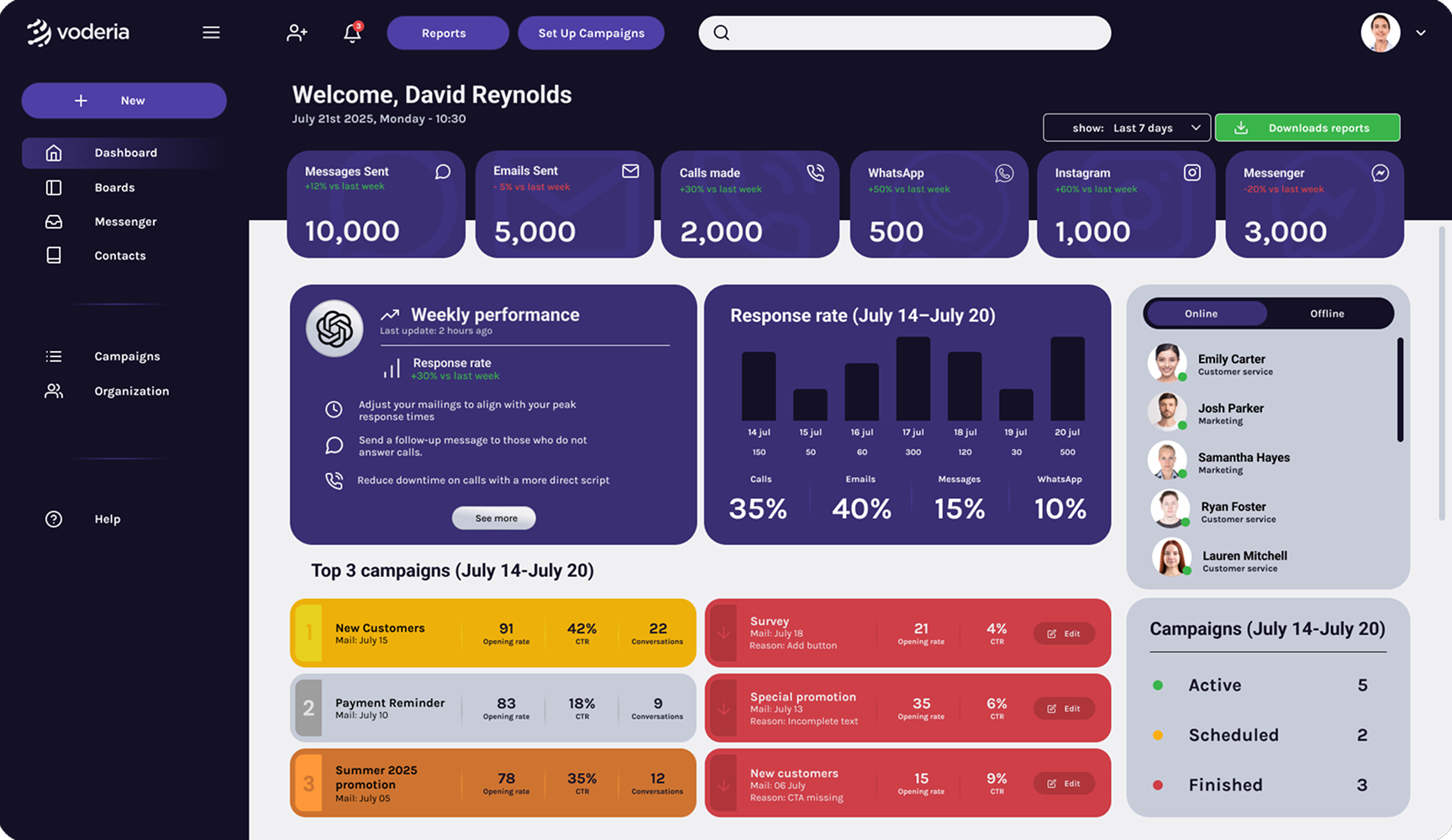 With Voderia, you can customize your campaigns and manage all communications from one place, both through virtual & human agents, ensuring efficiency and personal care.